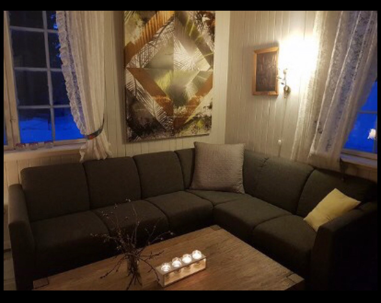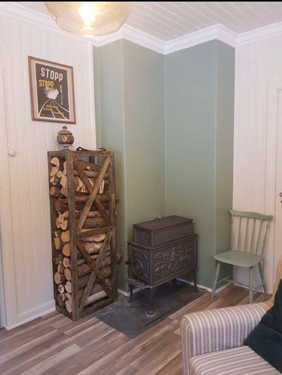 I 1. etasje finner du stort kjøkken, stue og spisestue. Huset har totalt 4 effektive vedovner og masse ved finner du i uthuset, så forutsetningene for en romantisk aften skulle så absolutt være tilstede...